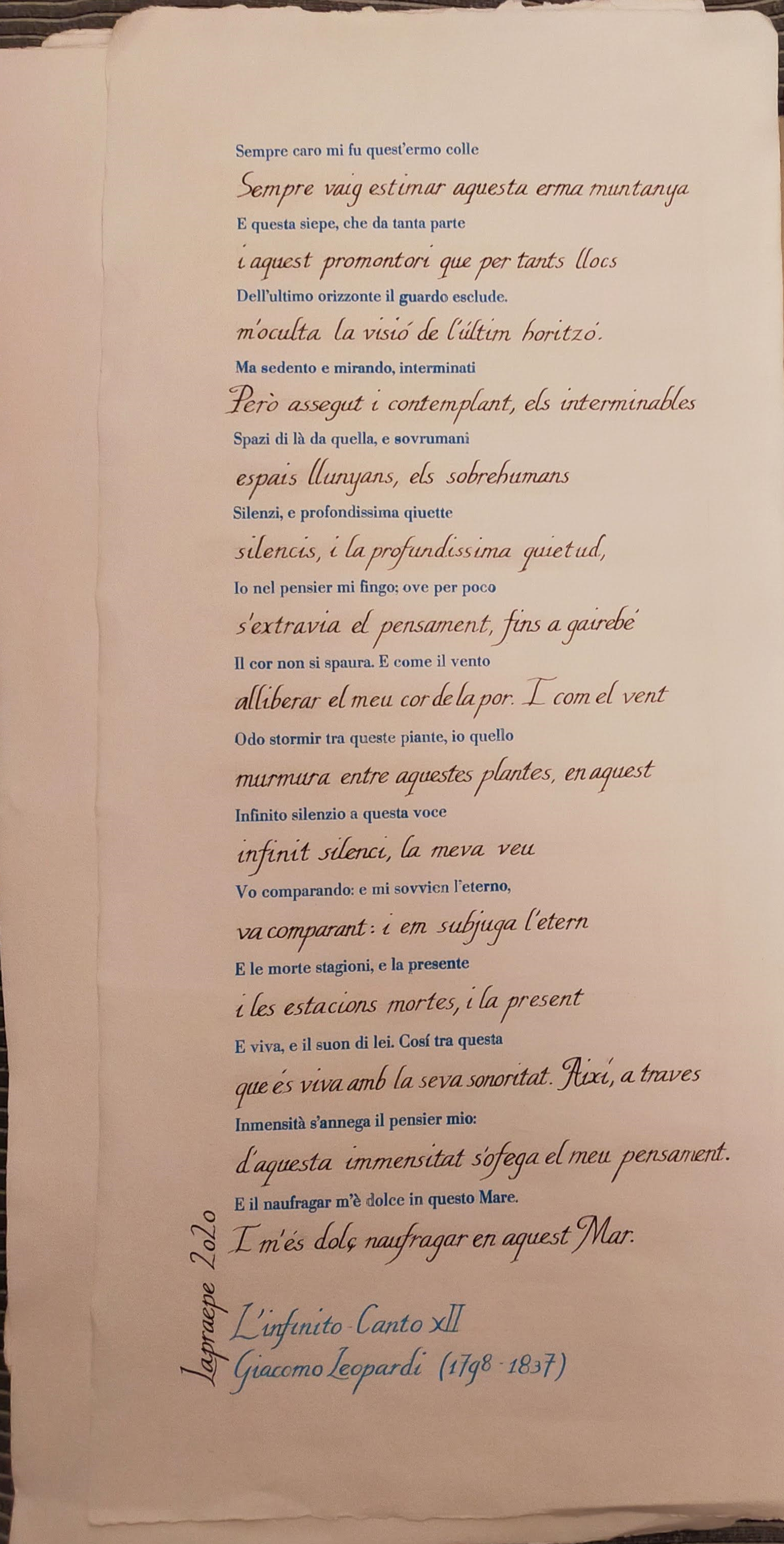Un boceto para la exposición de la muestra de trabajos caligráficos del gran Giacomo Leopardi, me llevó a la idea de mezclar el tipo con la caligrafía. Lo primero era encontrar entre mis amigos-amigas, alguien que tuviera una fuente con suficientes letras para componer el texto del poema. Después de buscar en la escuela BAU, en el taller de Anacrónica, y en mi taller actual (Gràfiques Oliveras) una tipo lo suficientemente grande (24 puntos) y con las suficientes letras (43 letras “e” por ejemplo), encontré en el taller de mi amiga Arcangela (Laurenpress) una Híspalis de 24 puntos de la fundición Iranzo, y como me pareció perfecta para el trabajo me puse manos a la obra. Compuse el texto, y mientras lo hacía le pedí permiso a Arcangela para poder imprimir la obra en su magnífica Albión de 1845. También le pregunte de donde había sacado la tipo, sabiendo que la mayoría de estos le han venido de donaciones, o de compras en diferentes talleres. Se puso a reír y me dijo: ¡¡¡Es tuya!!!, de tu antiguo taller familiar… Ahí fue cuando supe (aparte de preocuparme por mi memoria…) que haber venido a su taller a buscar la tipo no era casualidad…era el destino… Bien, después de la alegría de poder usar “mi propia tipo” para hacer el proyecto, terminé el molde, preparé una tinta de color azul cielo, y me puse a imprimir 5 copias con un precioso papel especial de algodón (cedido esta vez por otro amigo, Luis Morera de la fábrica de papel Ca L’Oliveres de Sant Quintí de Mediona). He de hacer constar aquí que por otra de esas casualidades que me persiguen sin cesar, el nombre de la fábrica de papel, y el de mi actual trabajo es casi…el mismo. El del árbol, que no solamente sirve para fabricar papel, si no que nos surte del apreciado aceite para cocinar, y también para fabricar las tintas de las Artes Gráficas… Una vez acabadas de imprimir las copias, solo tuve que romperme los cuernos para poder escribir con mi basto estilo de Itálica la traducción del poema al catalán, y colgar la obra en la exposición. Por cierto, estoy de casualidades hasta el moño, pero sabed que Arcangela es de ascendencia italiana, y (como no) me ayudo en la traducción del poema…